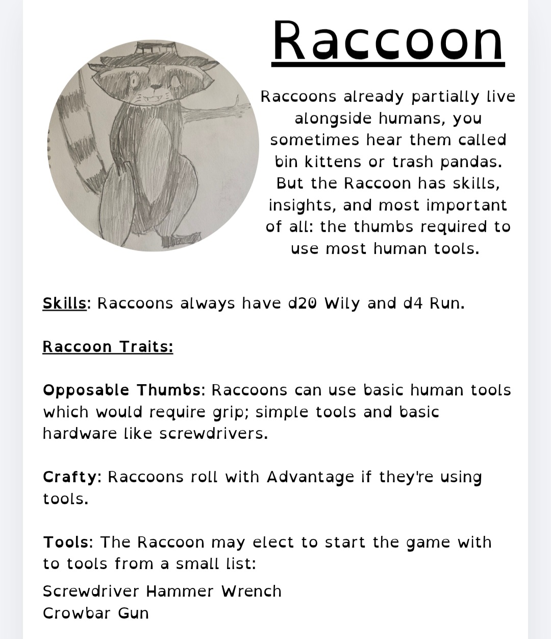 This game uses PBTA style archetypal playbooks with the Kids on Bikes dice system! Customise your Critter as a Muscle Bear or a Raccoon Sneak, or a Muscle Raccoon or Getaway Driver Lizard!